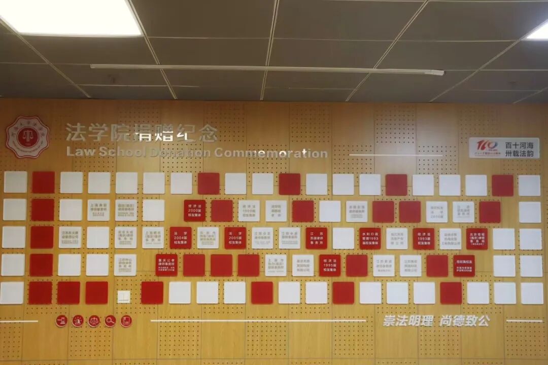 自2005年河海大学九十周年校庆以来,各地历届校友和社会各界以及法学院刘惠明、龚鹏程等老师为了支持河海大学法学教育事业发展,以不同形式进行了捐赠。值此百十校庆之际,法学院于江宁校区902法学院学术报告厅旁设立捐赠纪念墙,以表鸣谢。
