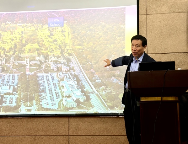 讲座开始,罗伟老师从申请国外法学院留学的程序出发,介绍了申请圣路易斯华盛顿大学法学院的相关渠道,并留下了个人邮箱等联系方式,欢迎有意向的同学与其进一步深入交流。紧接着,罗伟老师直观简洁地展示了圣路易斯华盛顿大学悠久的历史和优越的地理位置。