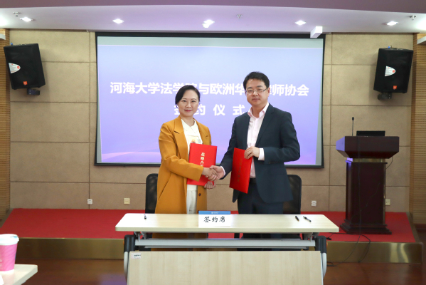 会上,河海大学法学院与欧洲华人律师协会正式签署合作协议。李栗燕院长代表法学院,与欧洲华人律师协会会长朱轶凡先生共同完成签约,标志着双方在涉外法治人才培养领域的合作正式落地。