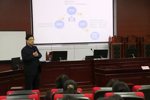 2025年11月21日下午3:50,法学院于河海大学江宁校区高B101成功举办法律诊所如何帮助法科生迈开实践第一步专题讲座,旨在帮助大一新生了解诊所法律教育与法学实践的重要性。本次讲座面向法学院2025级本科生,特邀中国社会科学院大学法学院副院长、副教授、硕士研究生导师苗鸣宇主讲,由河海大学法学院副院长吴志红担任主持,河海大学法学实践中心执行主任范艳萍全程参与。